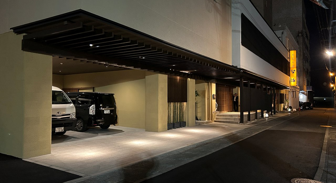 悠彩の宿 望海はその名の通り海を望む御宿ですが温浴棟の建設地は海浜公園に正対し、その右サイドに樹々の端から海が垣間見える状況です。その“限られた海”をいかに空間体験として昇華してもらうかを主題としました。