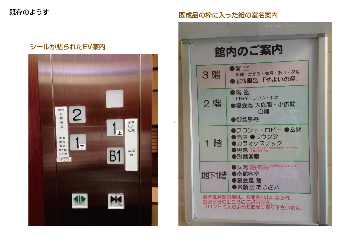 増築改築を繰り返した建物をまたぎ、館内の部屋・お食事処・湯に行けるようサインシステムを慎重に計画します。書体、質感、統一感は宿のイメージに大切な要素です。