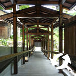 今回の改修工事にてスロープ・手摺及び回廊(屋根)を新設、床には融雪パイプを埋設しお客様が大露天風呂へ安全に安心して行けるように整備しました。また冬には積雪が多いため雪の重みに耐えうる様に構造は鉄骨造としていますが旅館の既存建物は情緒ある和風木造のつくりなので、既存と調和する様に柱・梁に板材を張り落ち着いた和の雰囲気としています。回廊(屋根)横の高台に展望テラスを新設し、天気の良い日にはひと休みしながら周辺の自然をバックに写真を撮影できるスペースを設置しました。また、遊歩道の廻りはもみじ等の樹木を植樹し修景したので秋には紅葉を見ながら露天風呂への散策も楽しめます。