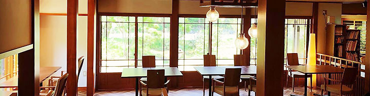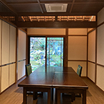 個室食事処兼ワーキングスペースは、池を配した自然豊かな中庭と一体感を持たせた開放的な空間となっており、静かな環境での食事や仕事に最適です。