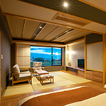 雰囲気の異なるお部屋を設けることでリピーターのお客様にも飽きのこないデザインとなっています。玄関にはスロープを設け、出入口の幅は85cm以上とし、水廻り(展望風呂・洗面脱衣室・便所)も広く設計していますので車椅子での移動がスムーズに出来るようになっています。和室にはお足の弱い方でも使いやすいようにベッドとソファーを設置しました。